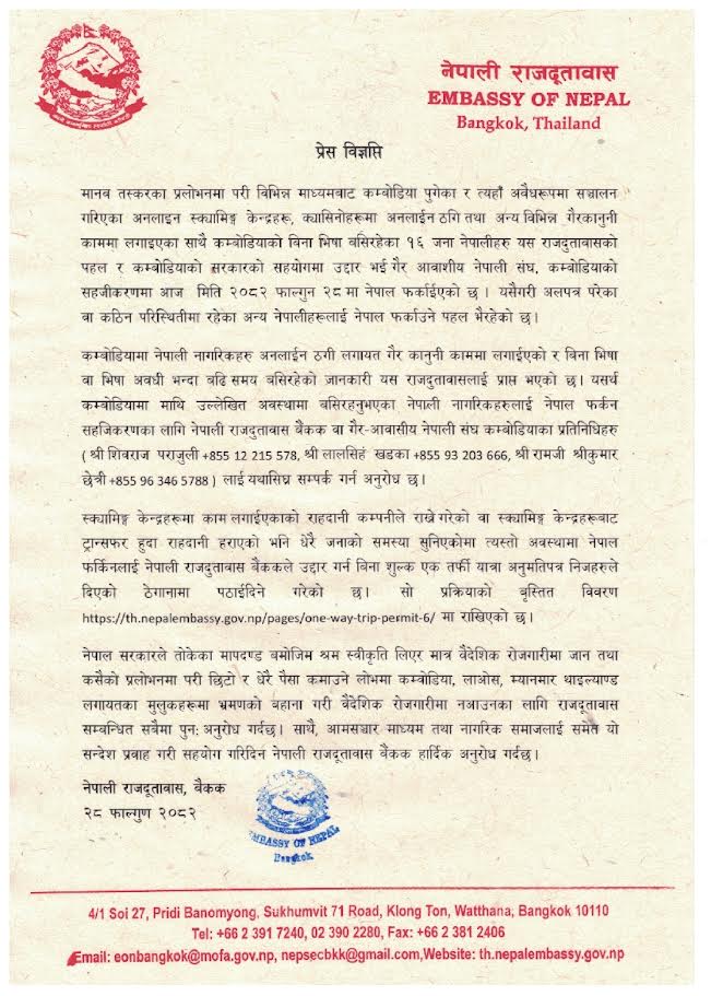 काठमाडौँ । कतार सरकारले त्यहाँ कैद सजाय भाेगिरहेका १३ नेपाली नागरिकलाई आममाफी दिएको छ । परराष्ट्र मन्त्रालयले बिहीबार विज्ञप्ति जारी गर्दै राष्ट्रिय दिवस र अन्तर्राष्ट्रिय मानव अधिकार दिवसका अवसरमा कतार सरकारले १३ नेपाली कैदीलाई आममाफी दिएकाप्रति कतार सरकारप्रति आभार प्रकट गरेको छ ।