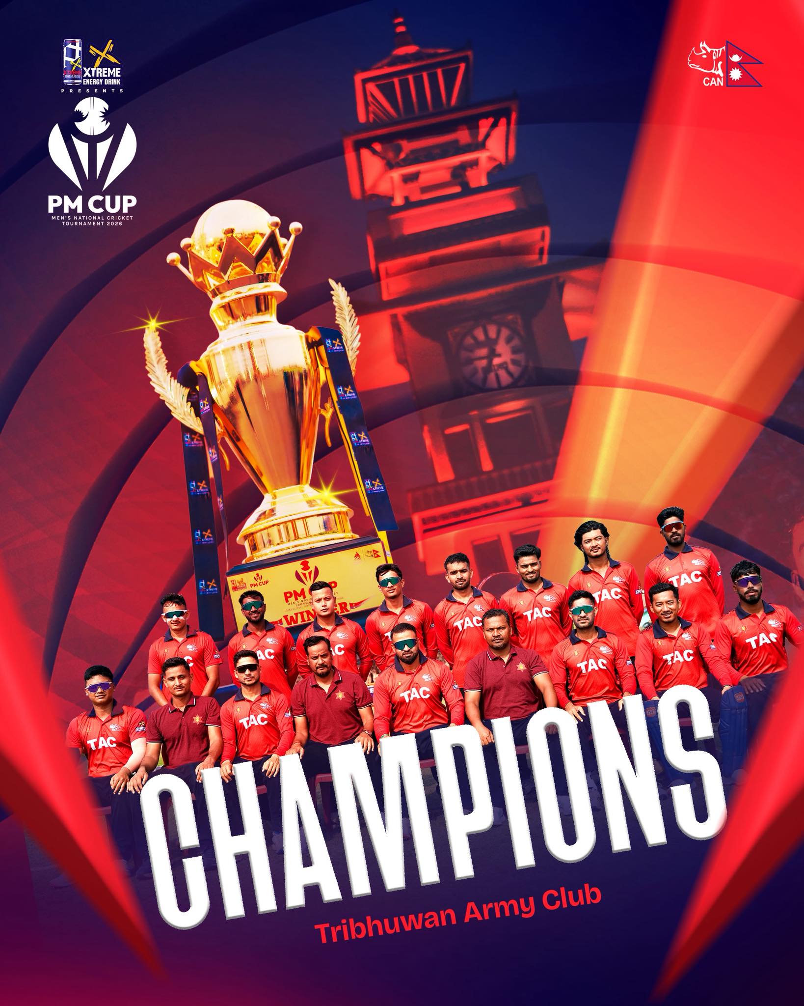 वीरगञ्जस्थित नारायणी क्रिकेट मैदानमा आज सम्पन्न फाइनल खेलमा सुदूरपश्चिम प्रदेशलाई पाँच विकेटले हराउँदै आर्मीले उपाधि चुमेको हो । आर्मी क्लबले दोस्रोपटक प्रधानमन्त्री कपको उपाधि जितेको हो ।