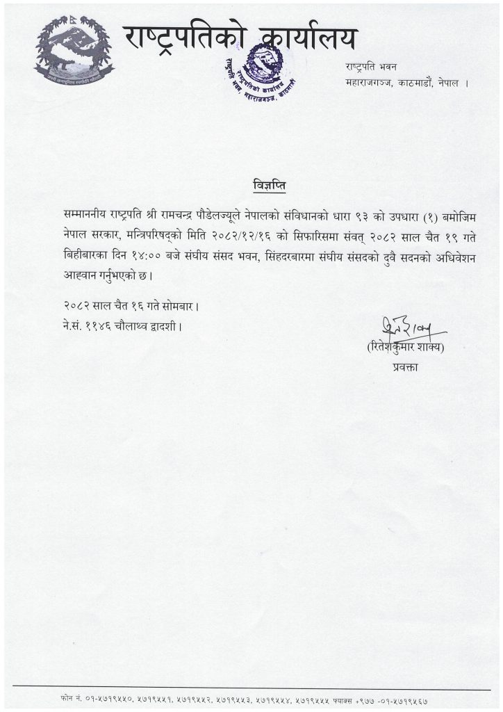 काठमाडौँ । राष्ट्रपति रामचन्द्र पौडेलले सङ्घीय संसद्को दुवै सदनको..