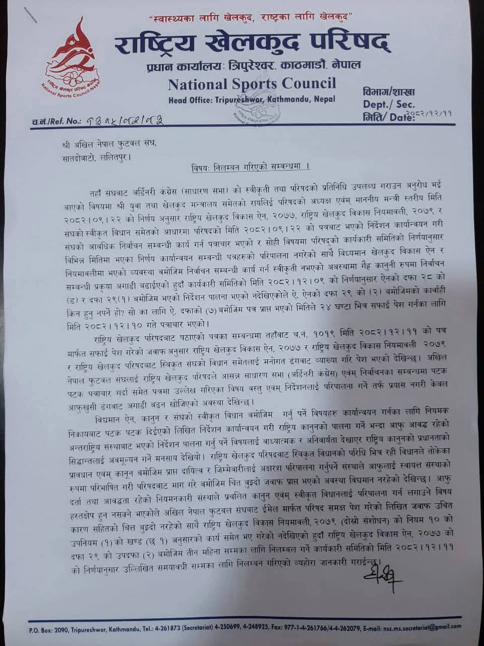 काठमाडौँ । राष्ट्रिय खेलकुद परिषद् (राखेप)ले अखिल नेपाल फुटबल सङ्घ (एन्फा)..